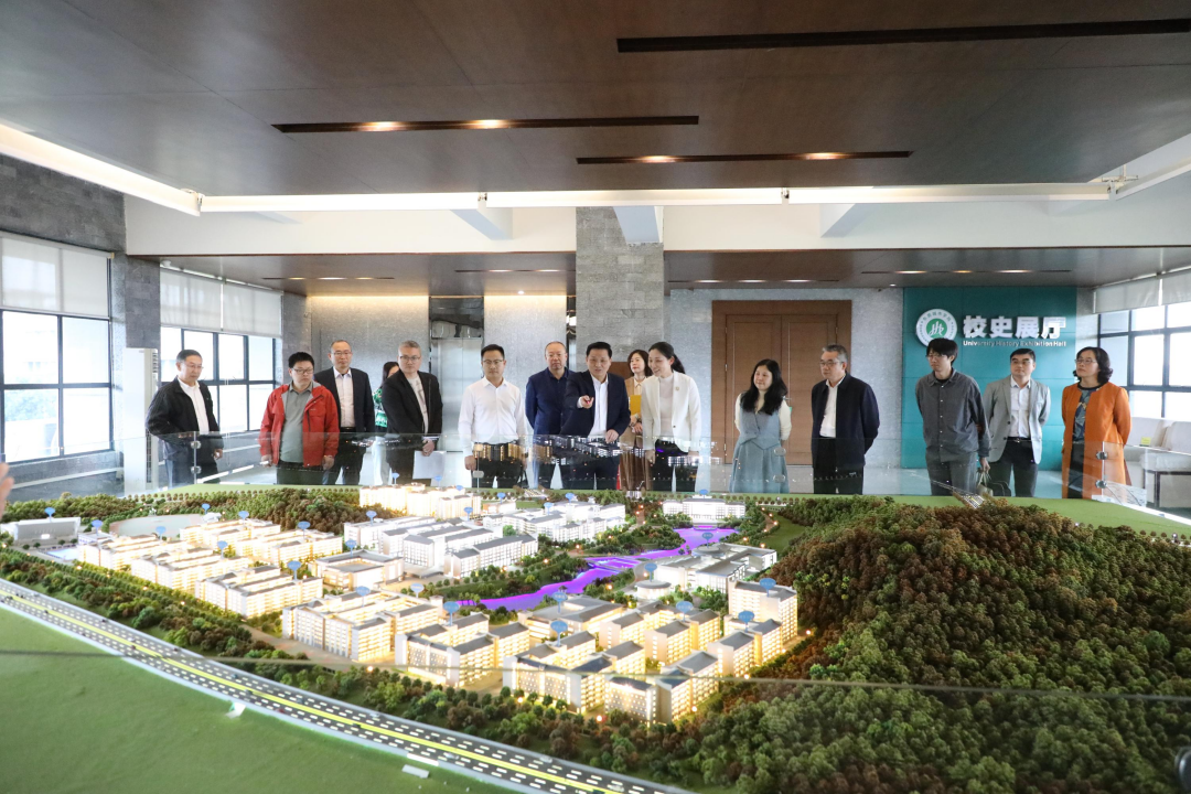下午 15 时 40 分,调研团抵达学校后,双方在行政楼一楼合影留念,随后前往六楼参观校园沙盘模型,学校领导详细介绍了校园整体布局、学科建设规划及产教融合发展布局。在行政楼 601 会议室,调研座谈正式拉开帷幕,会议由校长李振华主持。